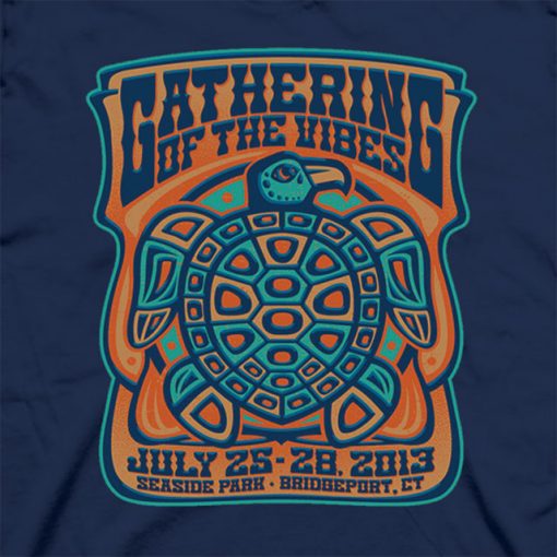 This dark blue t-shirt features the Warner Totem design on the front and the 2013 Line Up on the back! This is a staff favorite! Wear your support for the Vibes proudly with this great John Warner design.